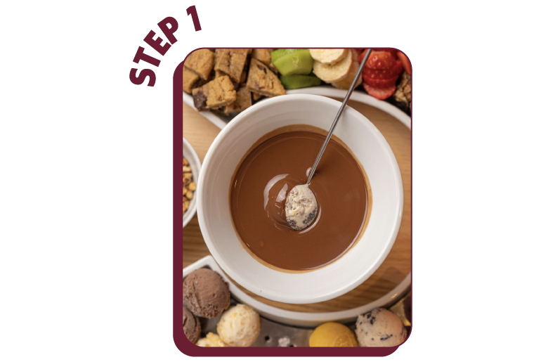 Ένα κουτάλι με μια μπουκιά επιδόρπιο βυθίζεται σε ένα μπολ με λιωμένη σοκολάτα που περιβάλλεται από φρούτα και παγωτό.